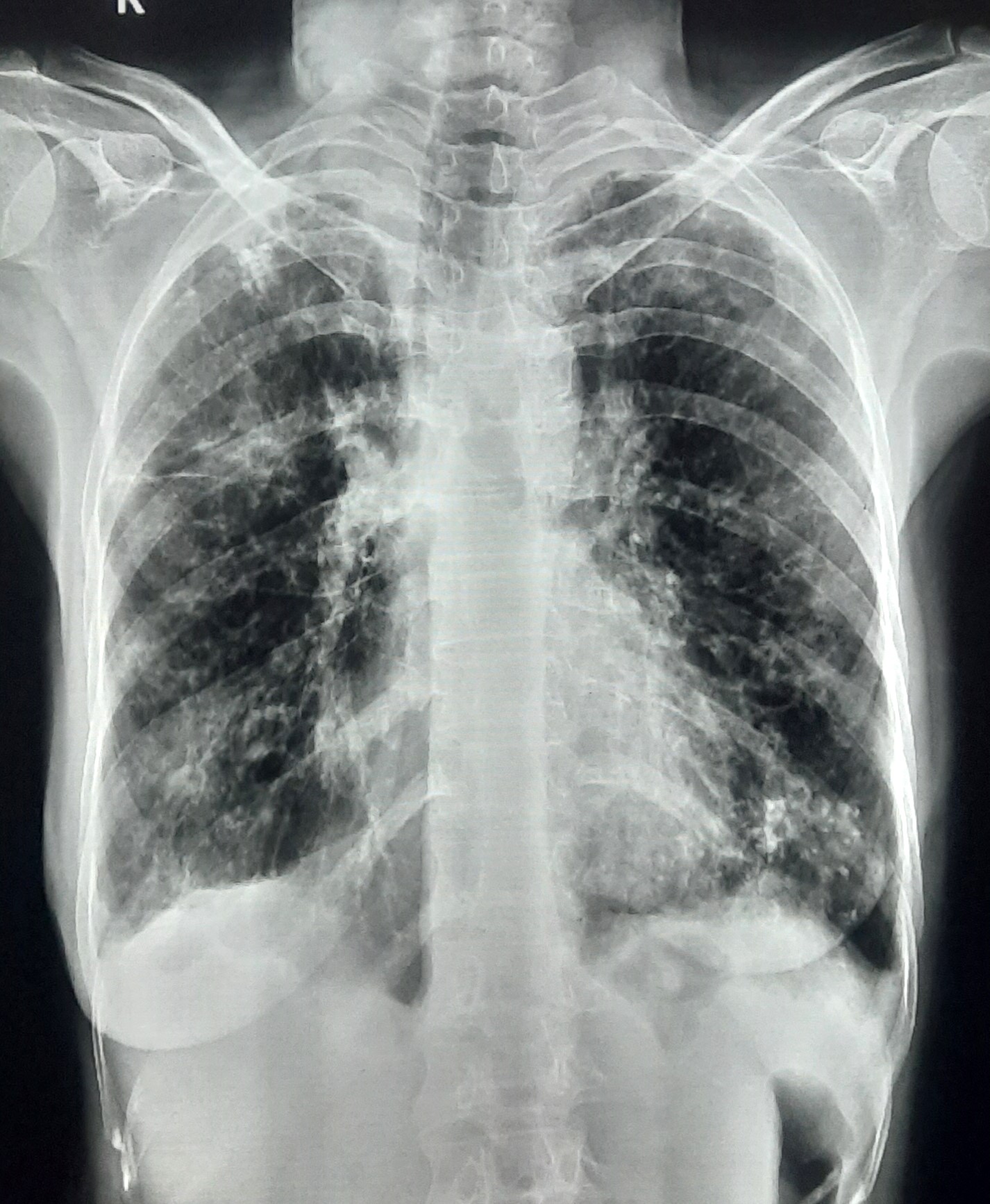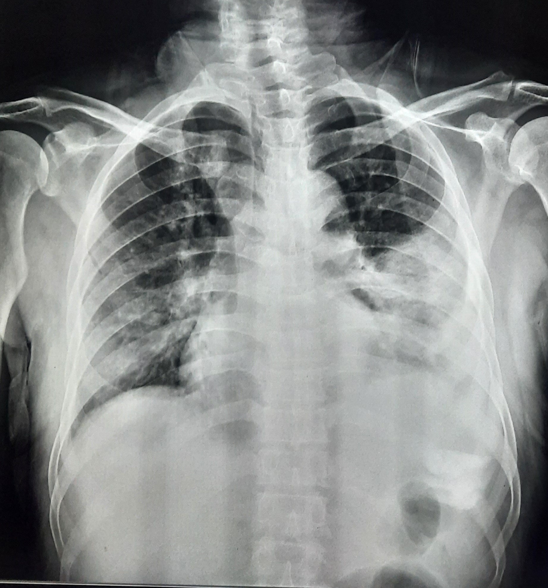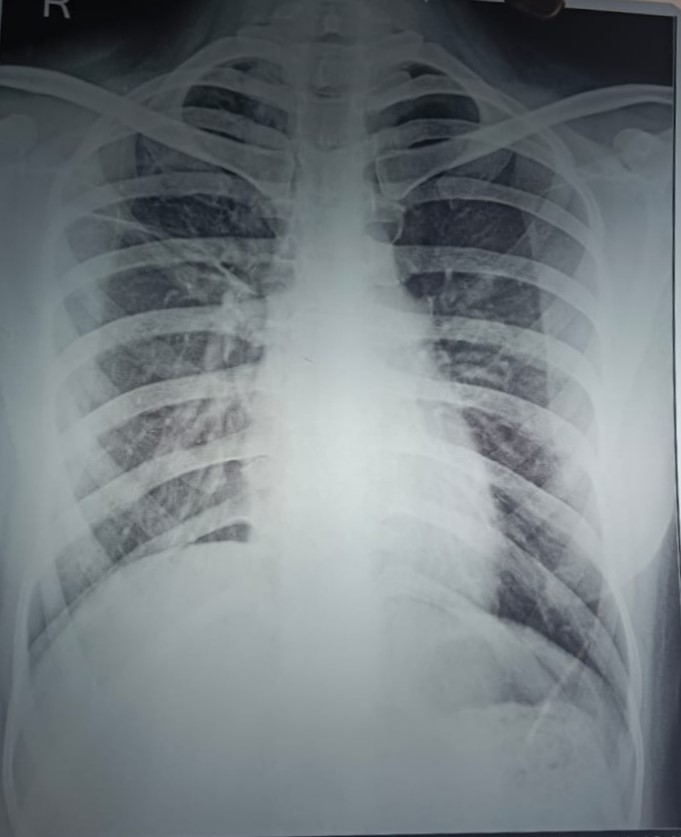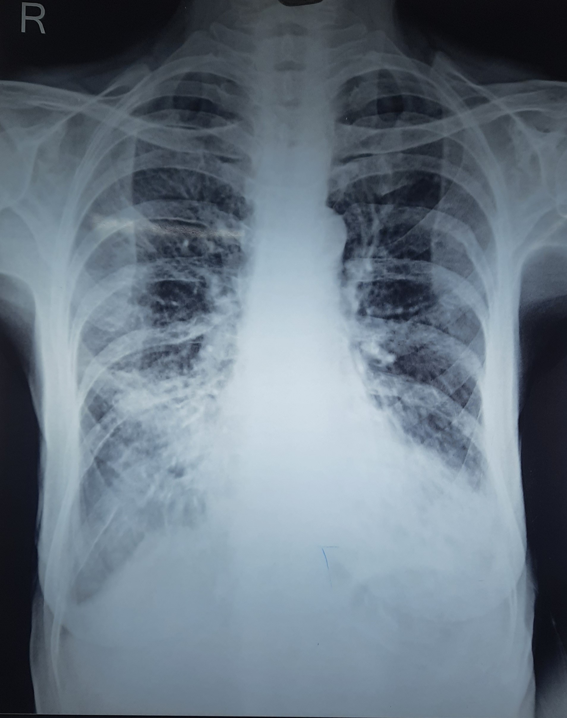 Right CP Angle Blunting Present With Right Upper Zone/ Mid Zone Ill-Defined Opacity With Left Upper Zone Infiltration Present | ? |