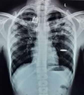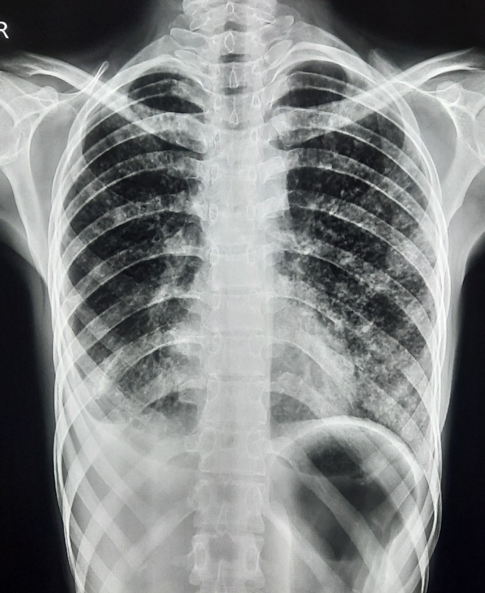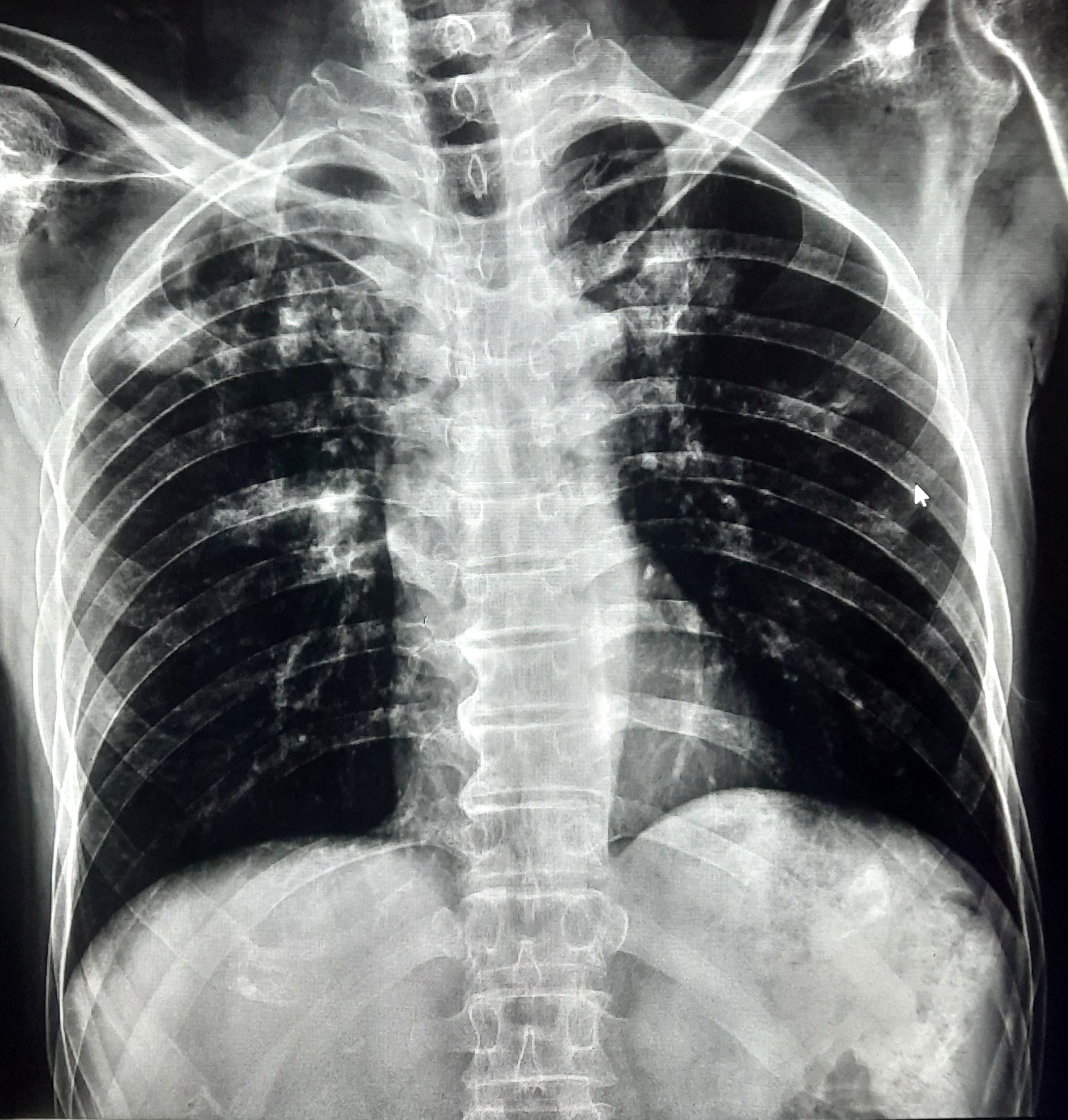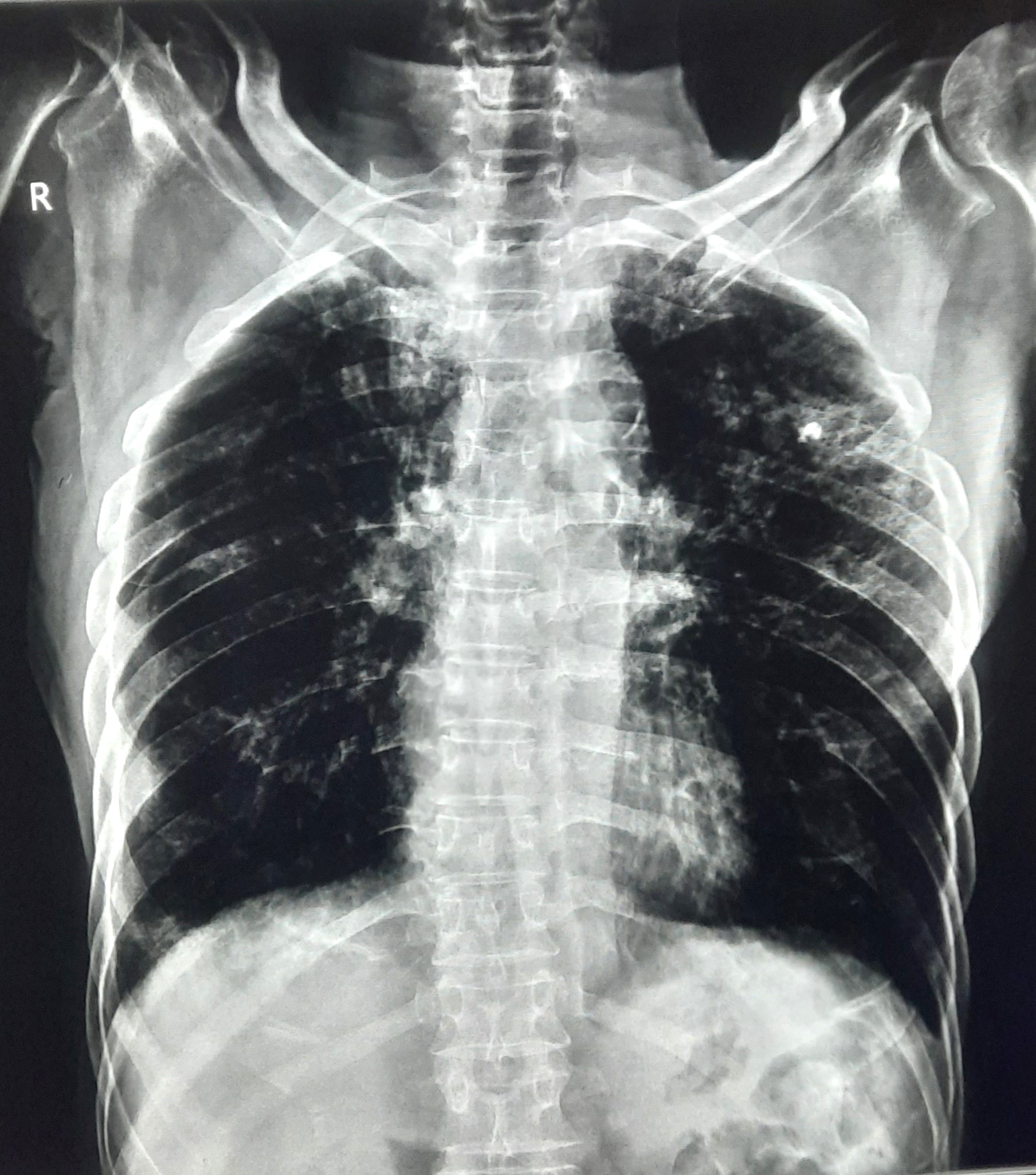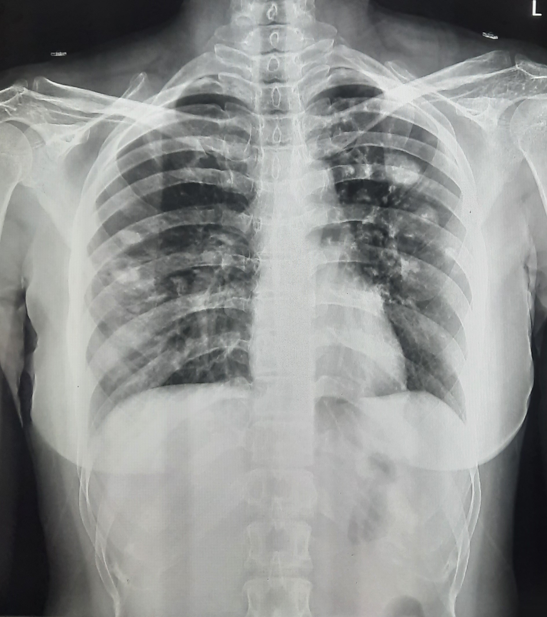 Right CP Angle Blunting Present With Right Upper Zone/ Mid Zone Ill-Defined Opacity With Left Upper Zone Infiltration Present | ? |