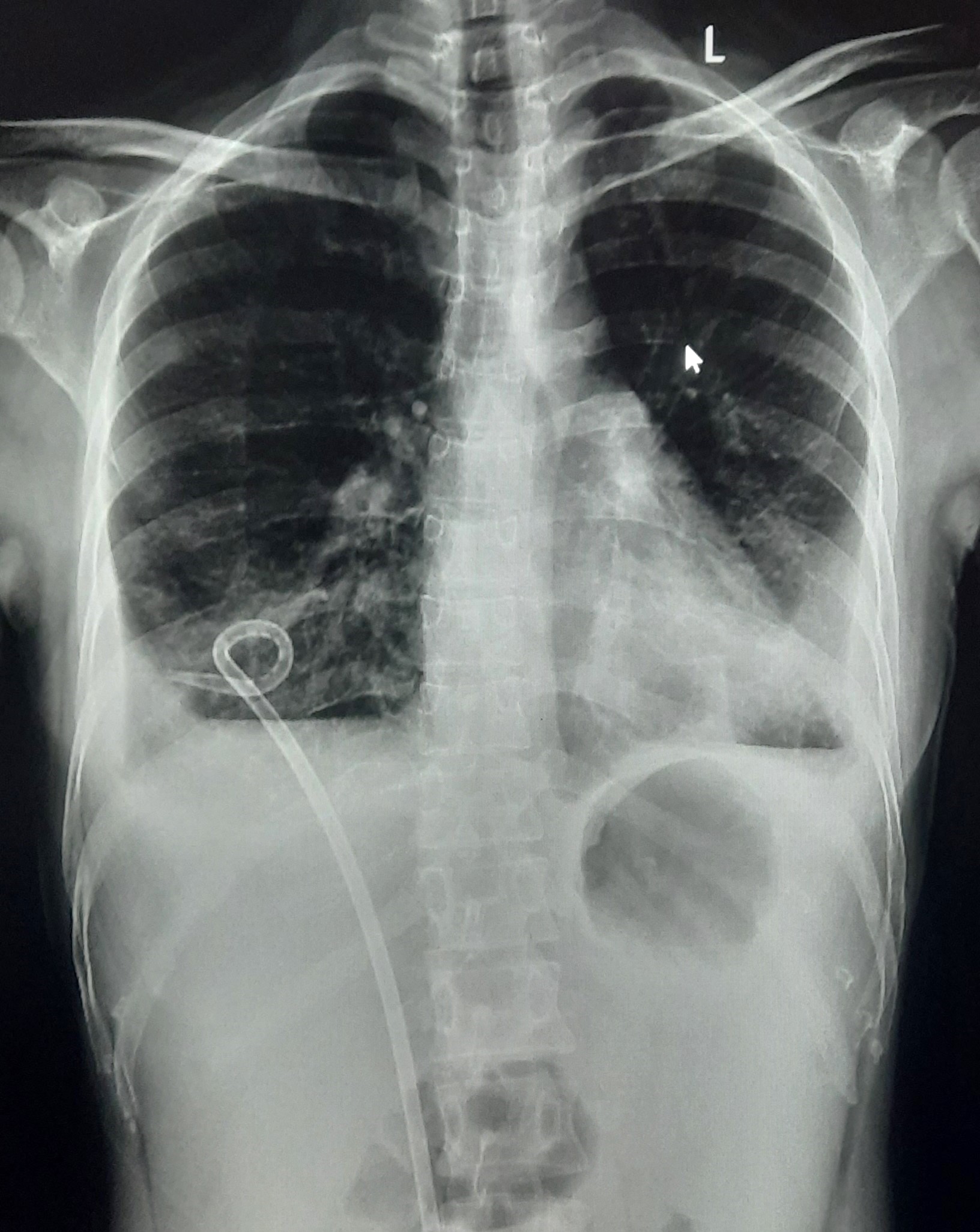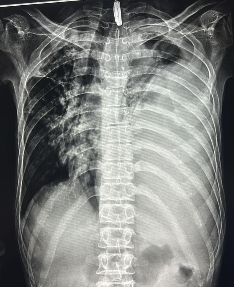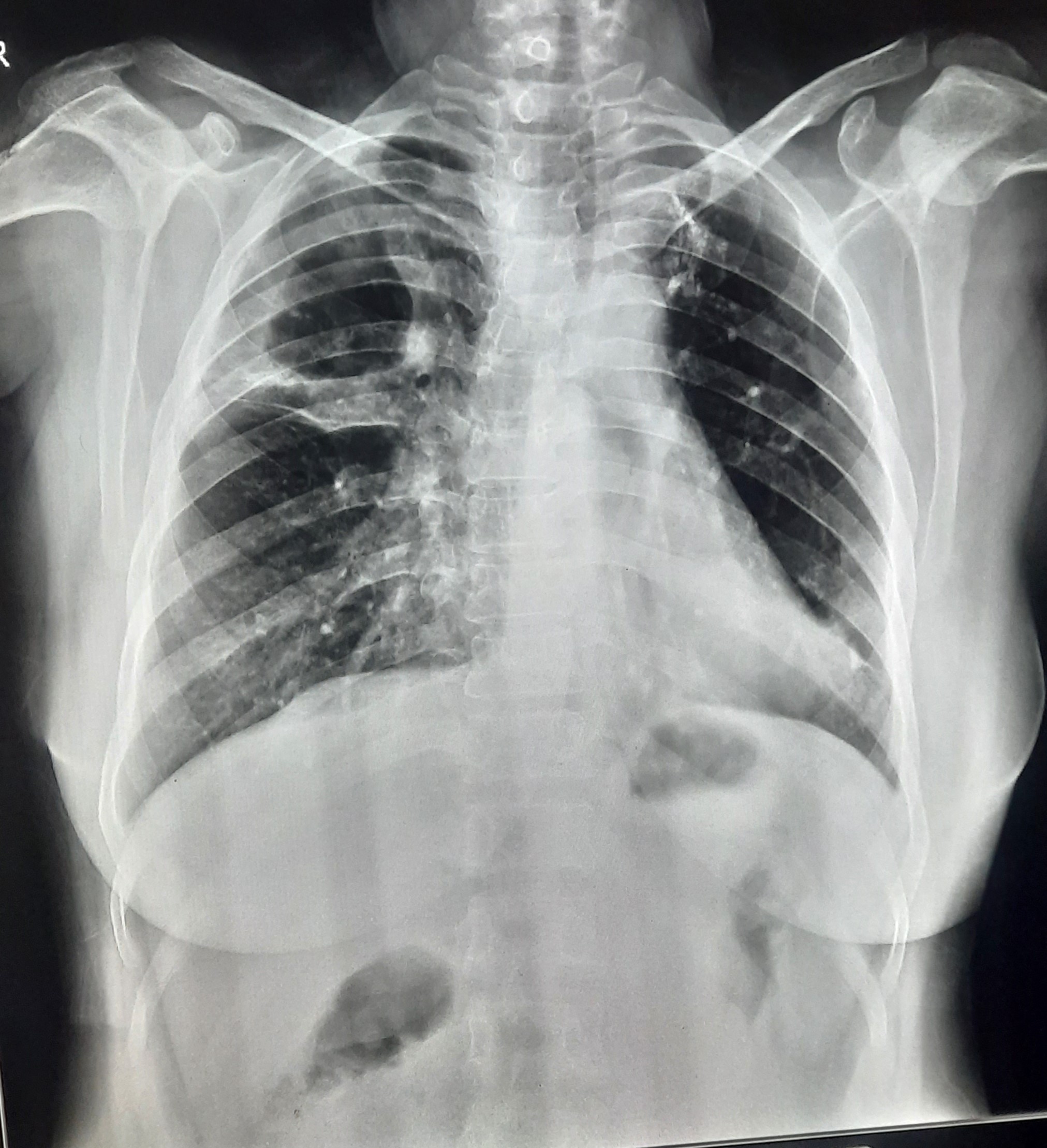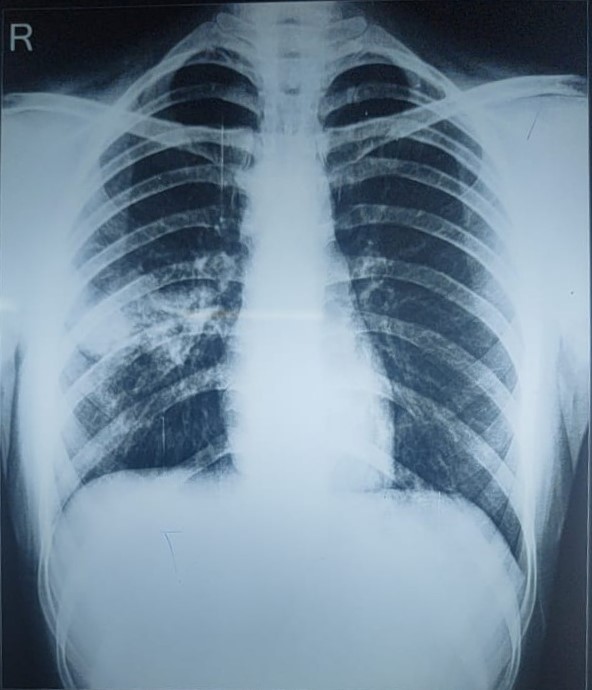 Final Diag : Right Sided Loculated Pleural Effusion (CxR- Microbiologically Confirmed PTB With Clinically diagnosed Right sided Pleural effusion) |