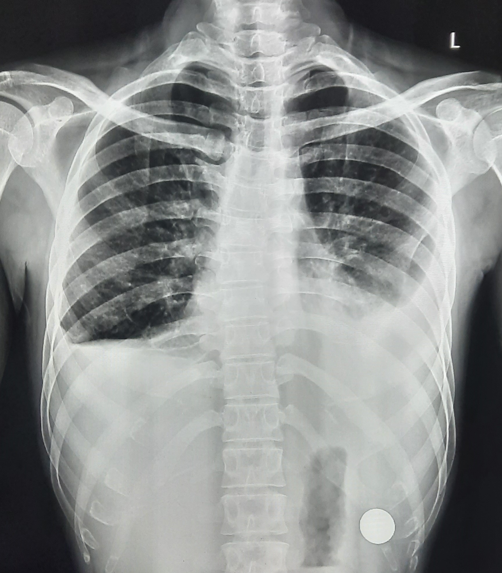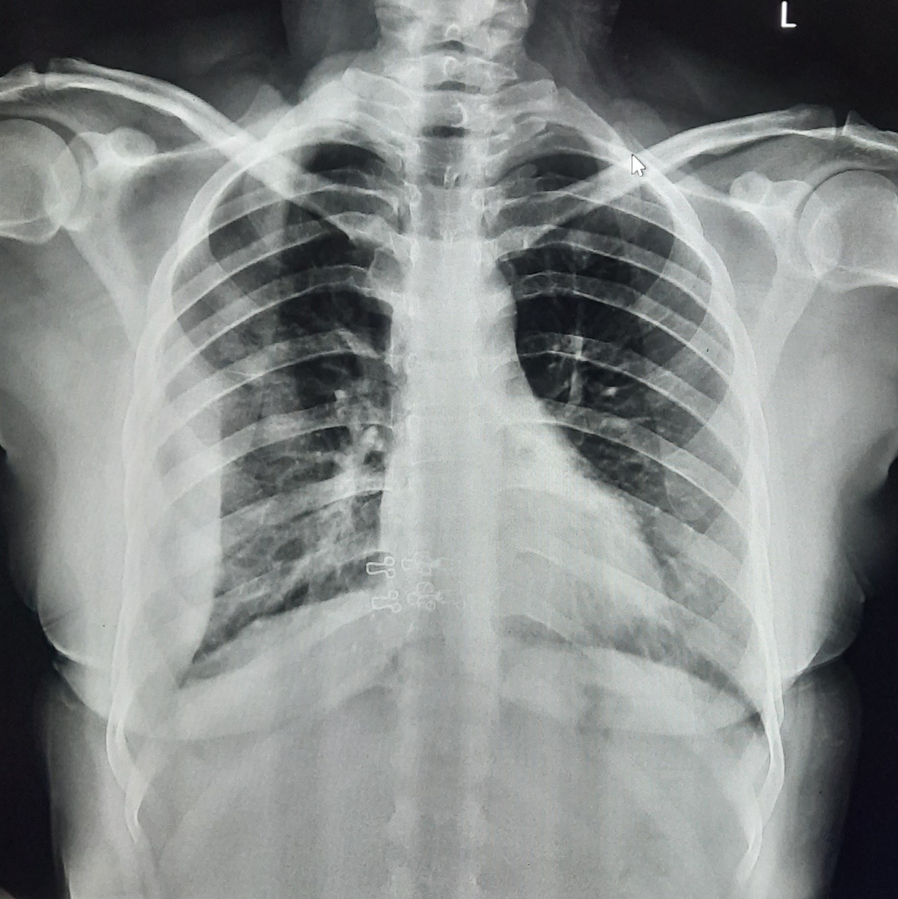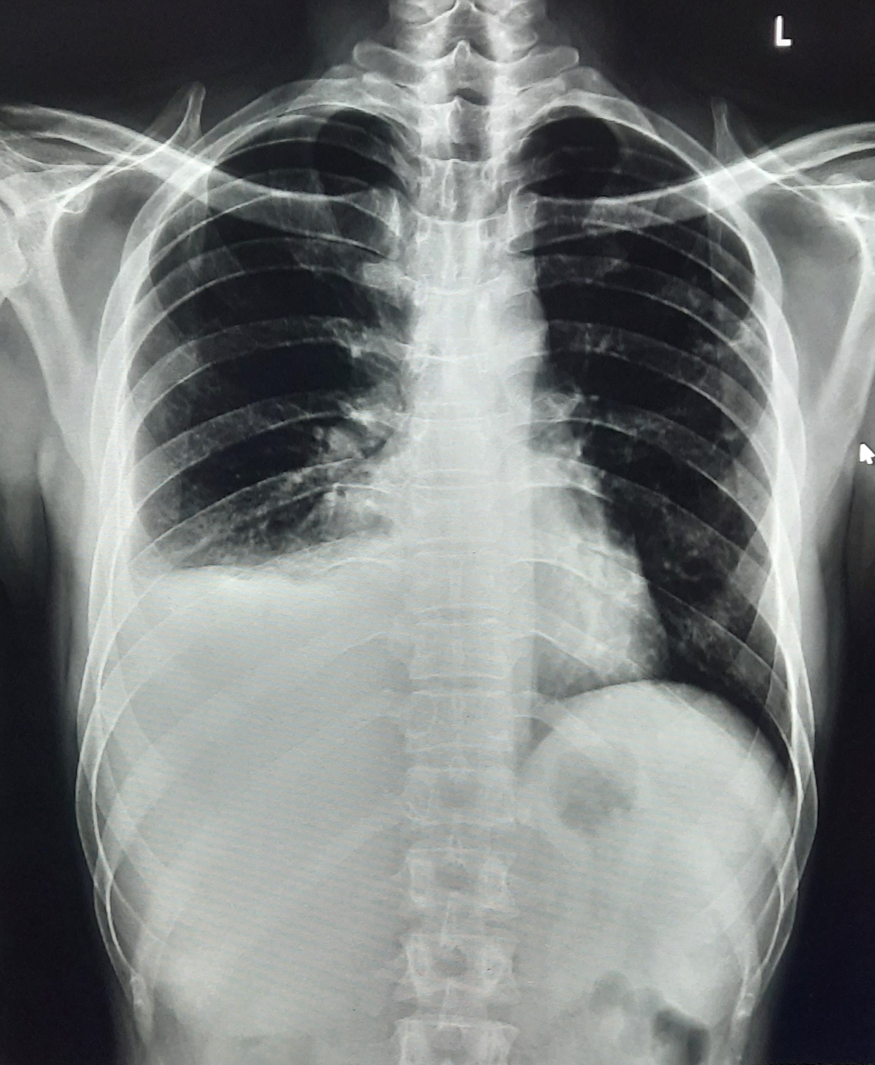 Final Diag : Right Sided Loculated Pleural Effusion (CxR- Microbiologically Confirmed PTB With Clinically diagnosed Right sided Pleural effusion) |