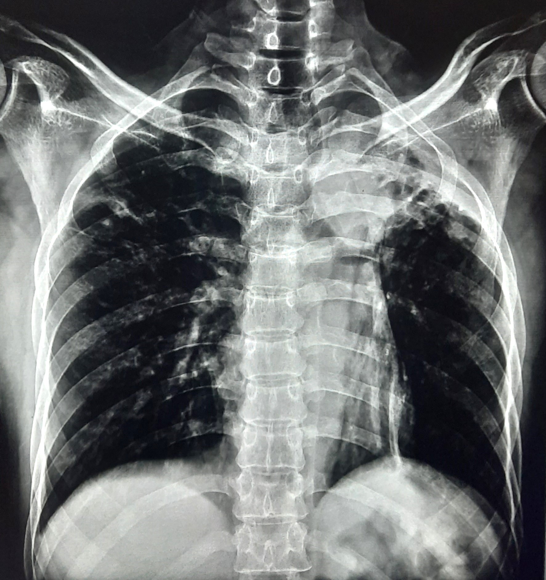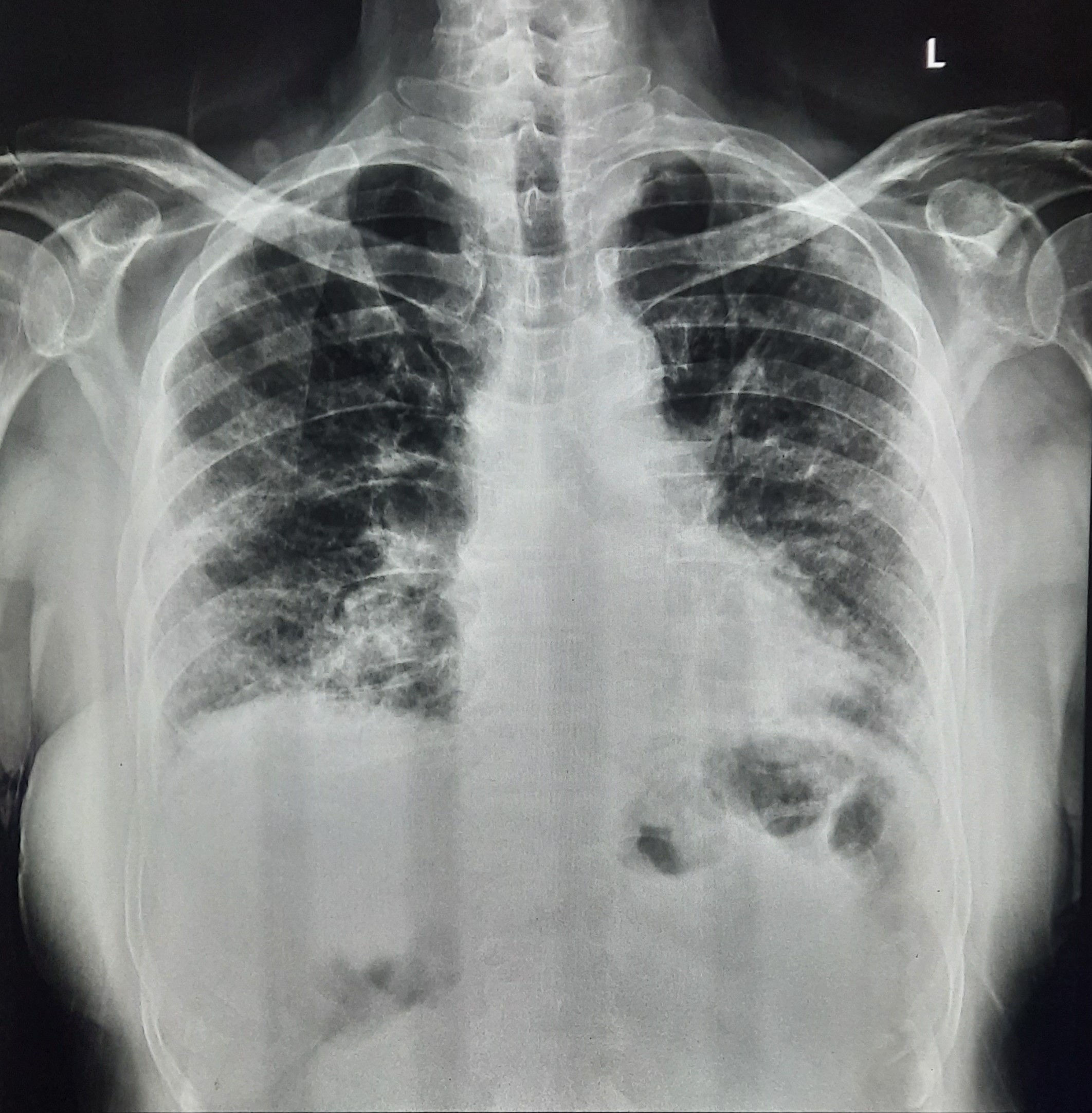 Post TB Sequelae | Bilateral Upper Zone Fibro Cavitary Changes With Right Upper Zone Fungal Ball With Bilateral Haziness With Tenting Of Diaphragm | Abnormality visible on x-ray |