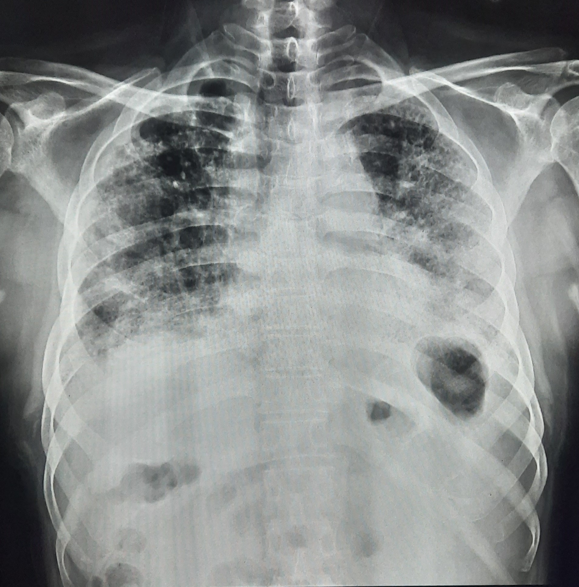 TB Case (Confirmed) | Bilateral Inhomogeneous Opacity In Right Upper Zone/ Mid zone/ Lower Zone/ Left upper zone With Fibro cavitary Lesion In Right upper Zone | Abnormality visible on x-ray |
