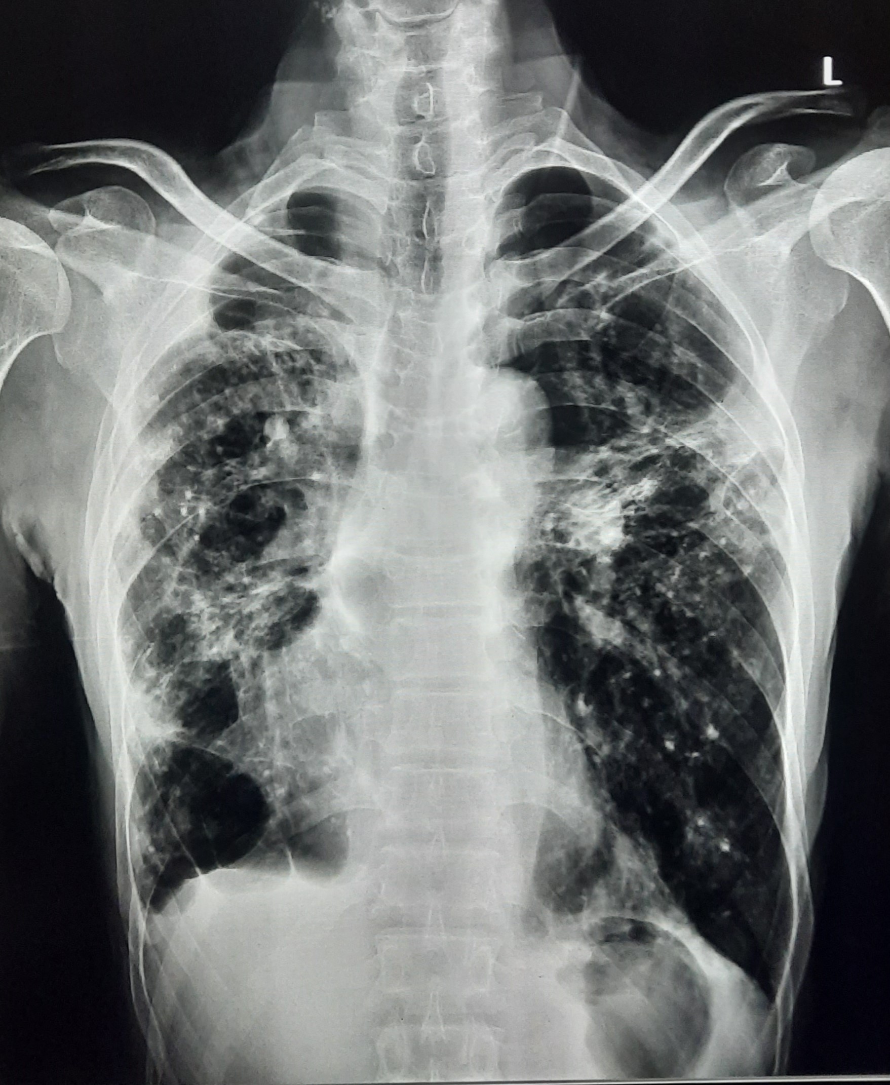 Post TB Sequelae | Bilateral Cystic Opacity Upper, Mid & Lower Zone/ Bilateral Reticular Opacites/ Bilateral Fibrotic Bands Present/ Decrease Lung Volume/ Few Old Calcific Nodules | Abnormality visible on x-ray |