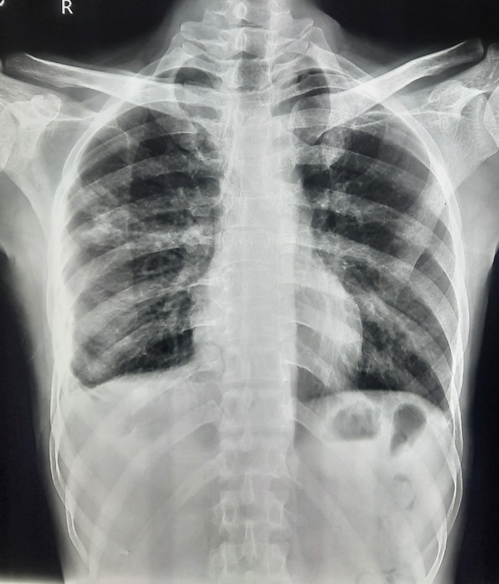 TB Case (Confirmed) | Bilateral Mid Zone & Lower zone Infiltration Changes Present, Right CP Angle Blunting Present, Overexposed X-ray | Abnormality visible on x-ray |