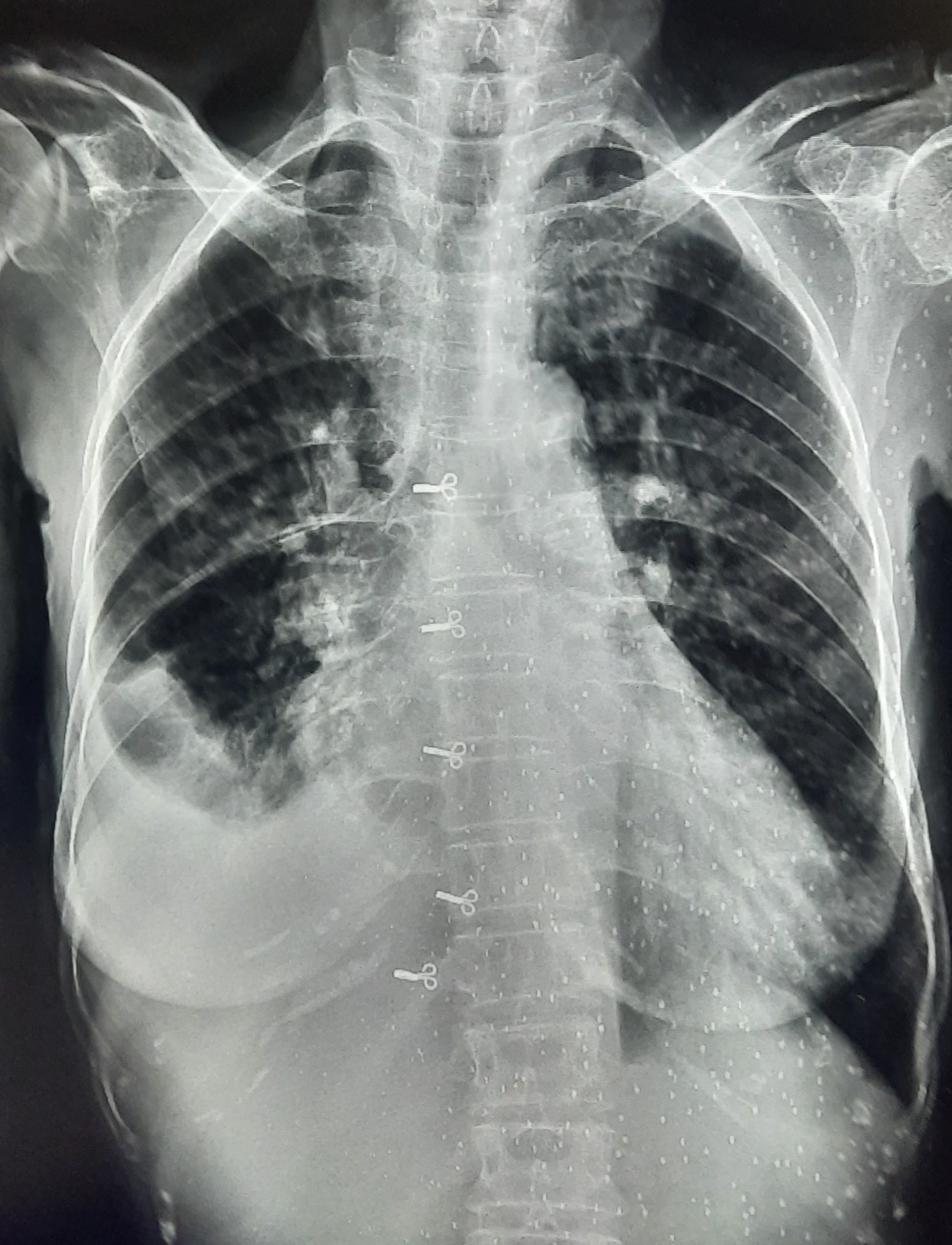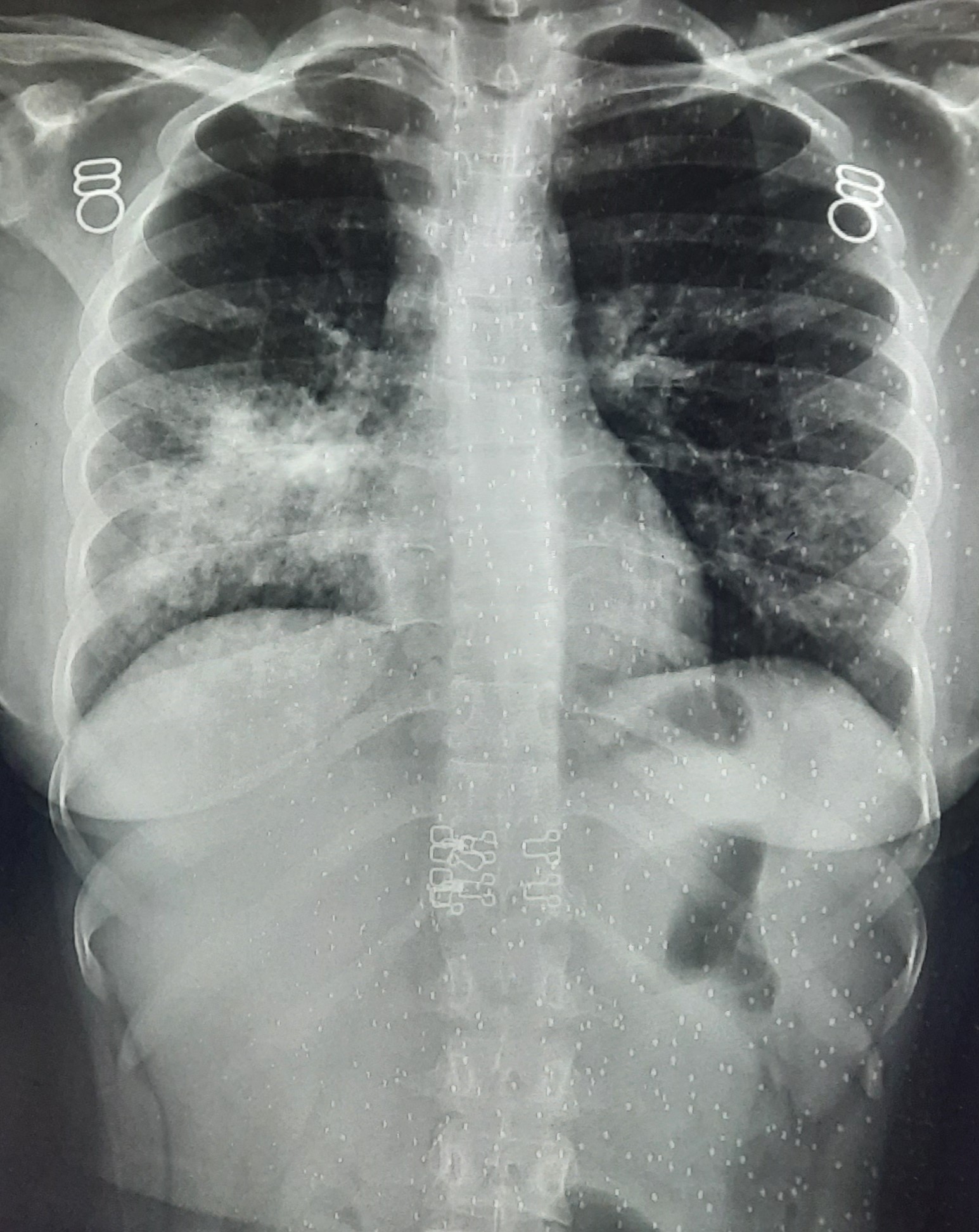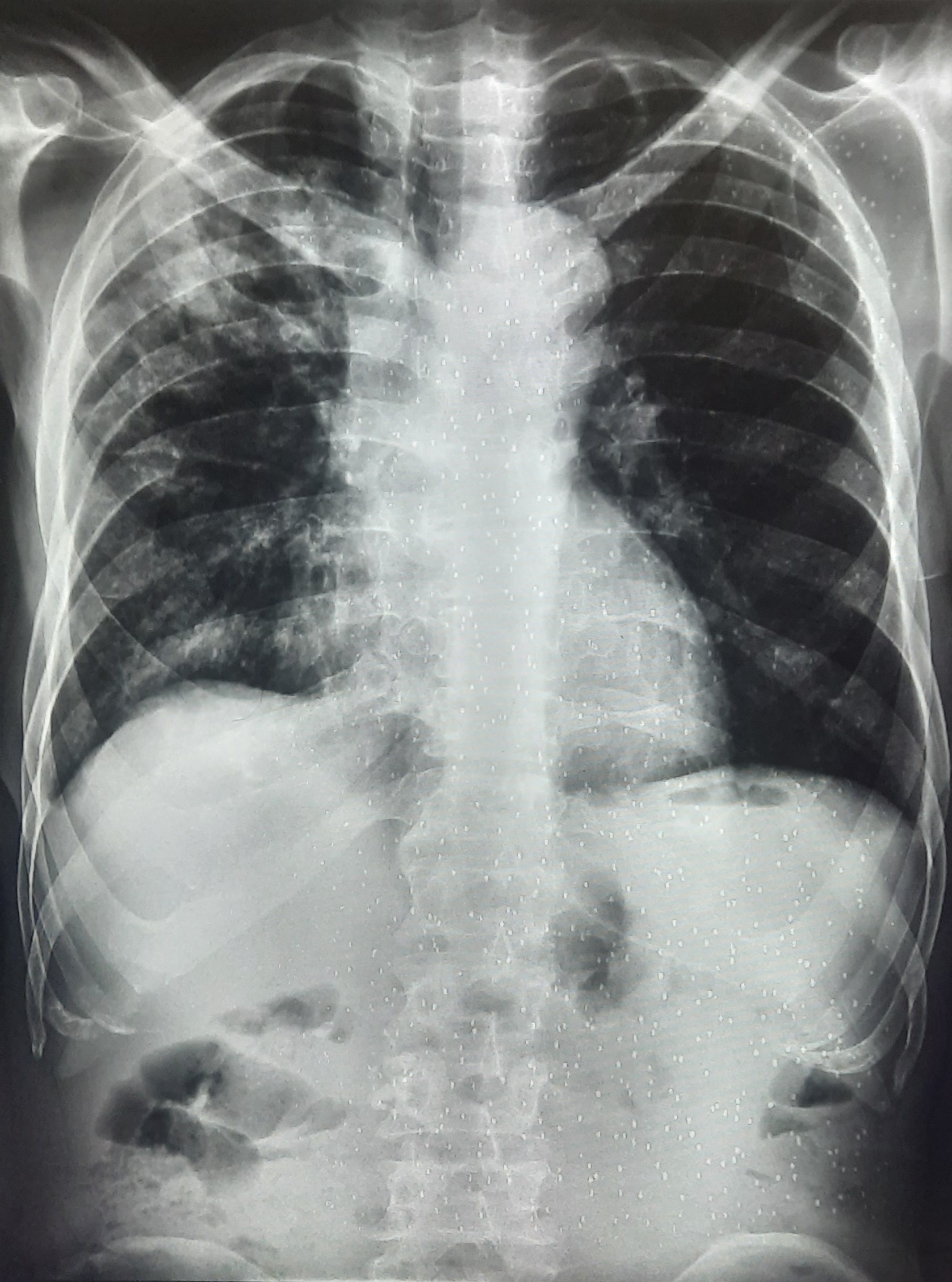 Final Diag : Disseminated TB (CxR- Right Middle Zone Consolidation) |