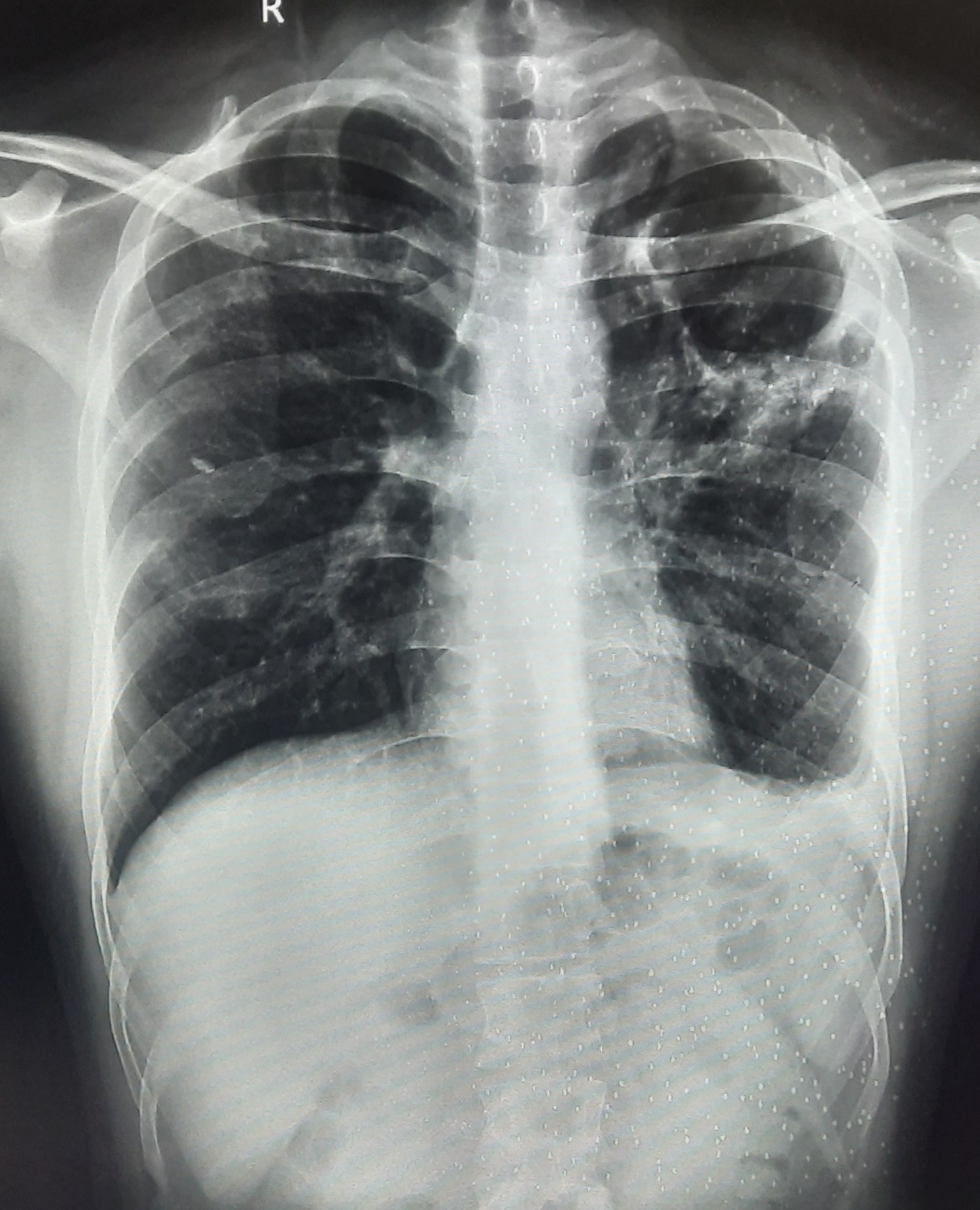 TB Case (Confirmed) | Right Sided Upper Zone Fibrotic Lesion, Tracheal Pull Left side, Right sided & Left Sided Pleural Thickening Present, Right sided & Left Sided CP Angle Blunting Present, | Abnormality visible on x-ray |